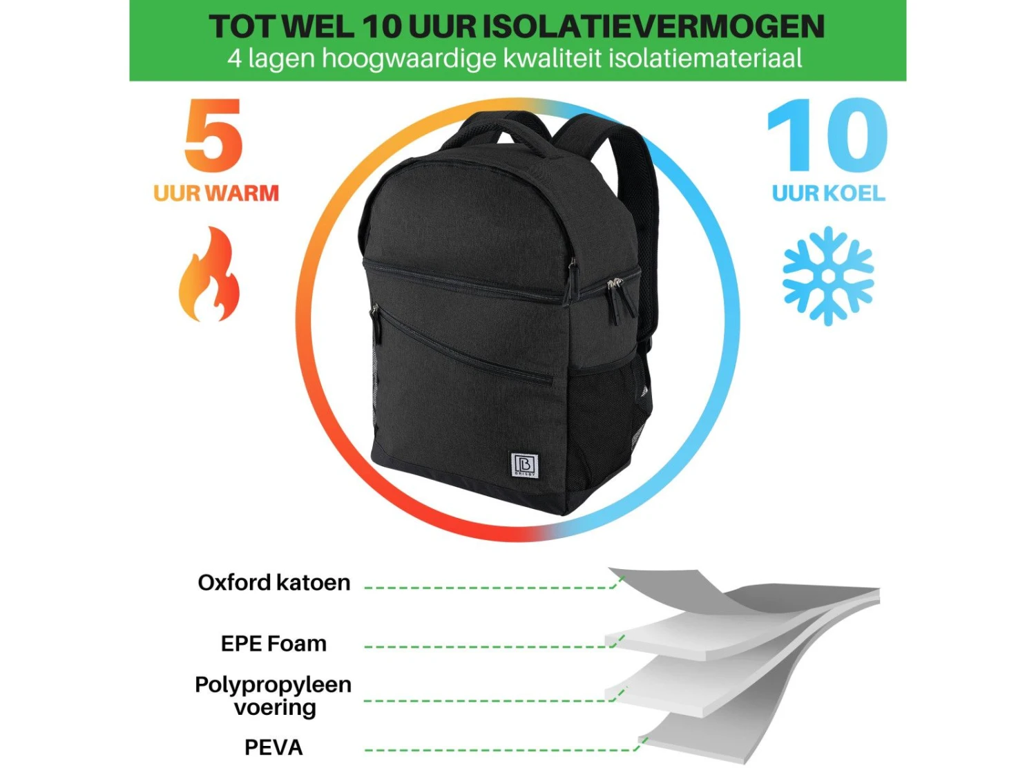 De koelrugzak van Brisby is onderverdeeld in 2 hoofdvakken. het onderste vak is voorzien van een isolatie van vier lagen, hierdoor blijven producten tot wel 10 uur op temperatuur. In het bovenvak is genoeg ruimte voor bijvoorbeeld je portomonee, telefoon, sleutels en een nieuw shirt of een handdoek.