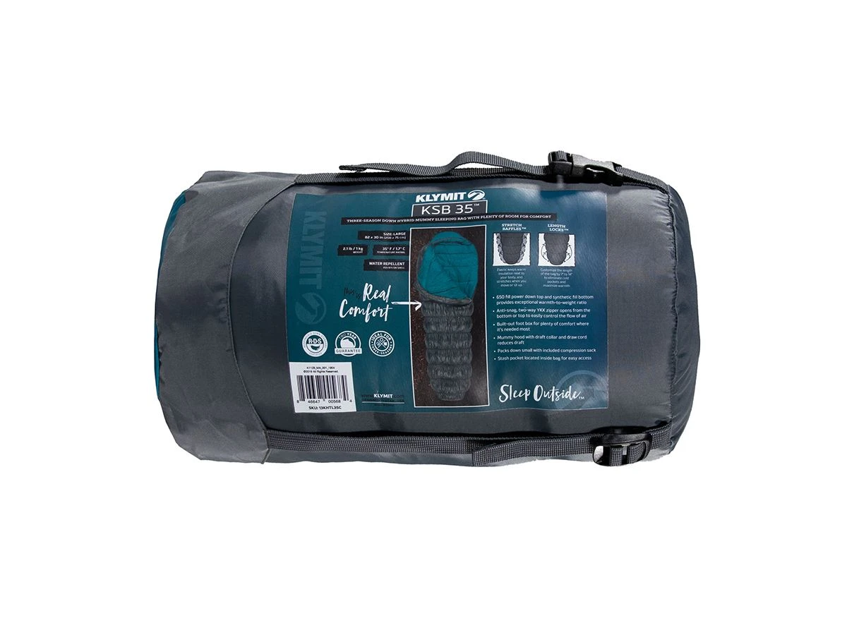 Een lichtgewicht, veelzijdige slaapzak met veel ruimte voor comfort tijdens koelere nachten. De KSB 35 heeft een vulling van 650 dons aan de bovenkant en een synthetische vulling aan de onderkant, voor een uitzonderlijke warmte-/gewichtsverhouding. Deze slaapzak heeft Length Closures™ waarmee u de slaapzak kunt inkorten en een tweewegrits waarmee u het voetengedeelte kunt openen voor ventilatie. Als u de rits helemaal opent, verandert de zak in een royale deken.