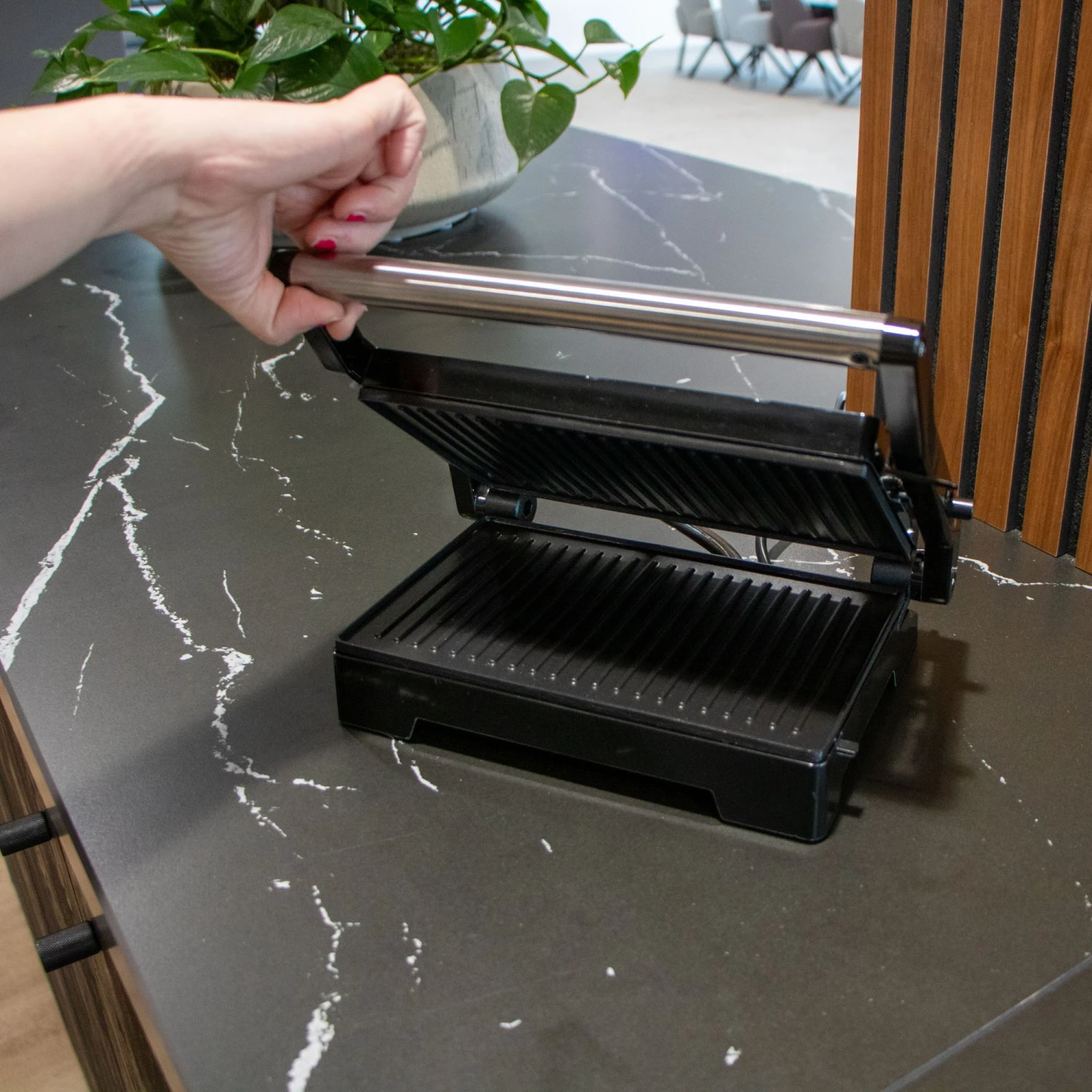 Het grilloppervlak van de grillplaat biedt met zijn afmetingen van 23 bij 14,5 cm voldoende plaats voor het tegelijkertijd grillen van bijvoorbeeld twee panini’s, twee tosti’s of een variëteit aan voedselwaren. Daarnaast kan de grill moeiteloos worden opengeklapt tot een tafelgrill, waardoor het grilloppervlak effectief verdubbeld wordt en je een interactieve kookervaring op tafel kunt creëren.