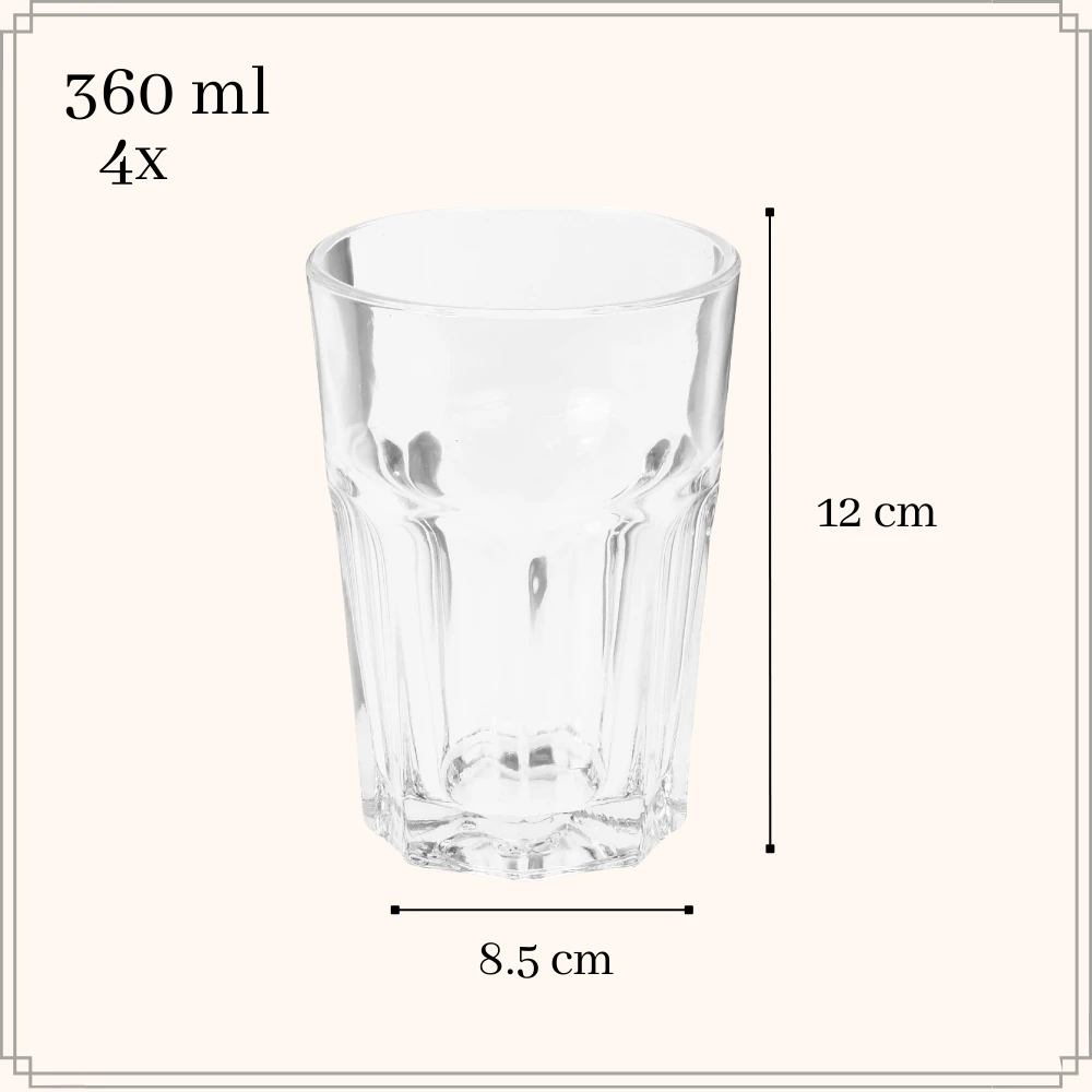 Deze glazen van Orange85 hebben een inhoud van 360 ml. De glazen zijn naast voor limonade ook voor andere dranken te gebruiken. De glazen worden geleverd in een set van 4. Elk glas is stapelbaar. Hierdoor is het opbergen van de glazen eenvoudig. De glazen zijn geschikt voor in de vaatwasser.