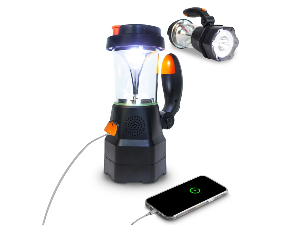 Deze alleskunner kan gebruikt worden als lantaarn of als handlamp, indien nodig dient een beugel als ophanging. Superheldere LED’s voorzien u en uw dierbaren betrouwbaar van licht. De geïntegreerde AM/FM-radio maakt grenzeloze muziek- en nieuwsontvangst mogelijk en mocht u ooit in een noodsituatie terechtkomen, dan trekt het onmiskenbare SOS-waarschuwingssignaal uw aandacht. Kleine elektronische apparaten zoals mobiele telefoons kunnen worden opgeladen via de geïntegreerde USB-poort, omdat de meegeleverde NiMh-batterijen ook dienst doen als powerbank van 2100 mAh.